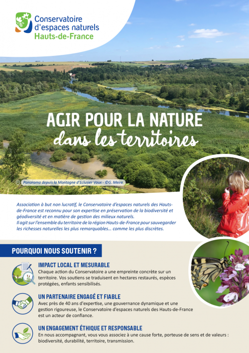 Cette plaquette reflète l’identité du Conservatoire d'espaces naturels des Hauts-de-France et met en lumière les missions que portent au quotidien ses salariés et bénévoles.