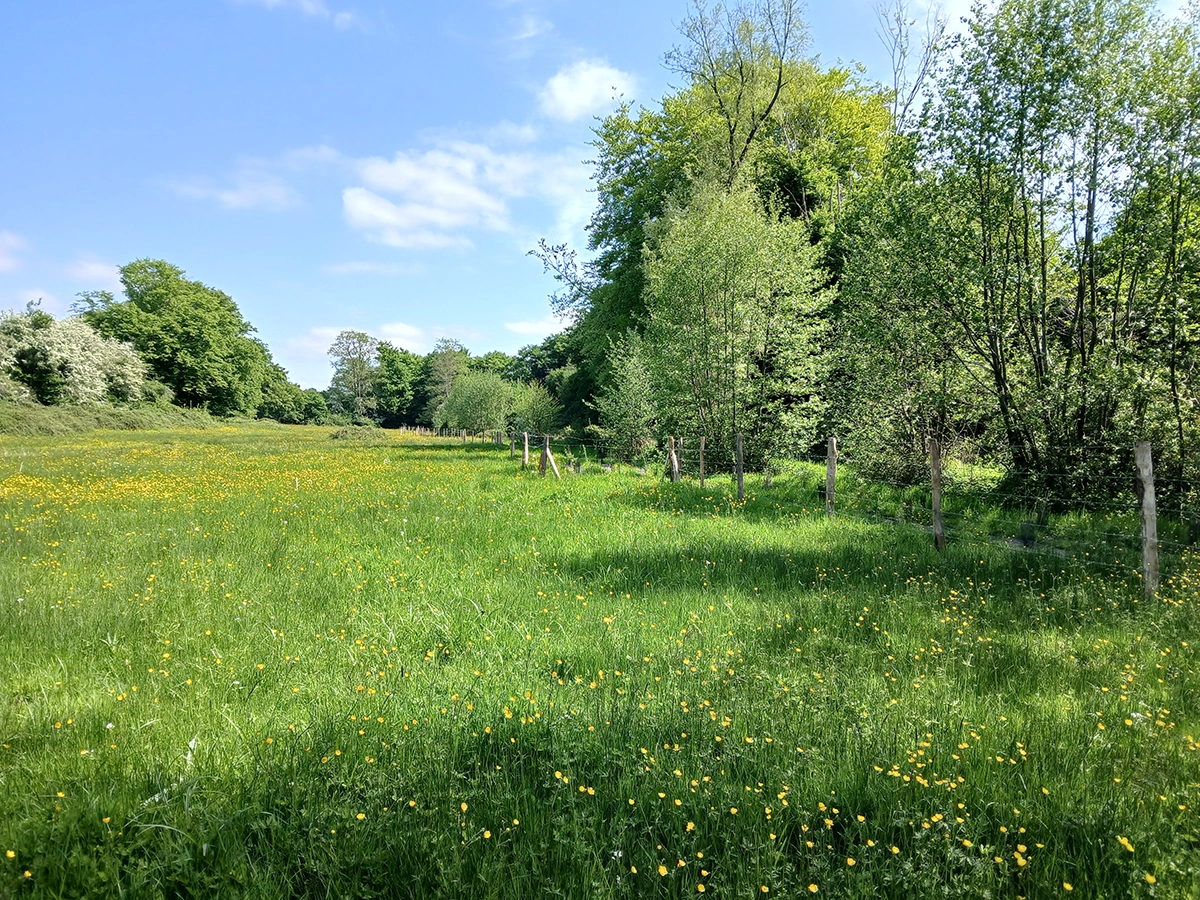Prairies mésophile à hygrophile fauchées et pâturées, présentant de beaux alignements de charmes têtards, en berge du ruisseau Saint-Pierre, restaurées dans le cadre des mesures compensatoires à l’aménagement de la