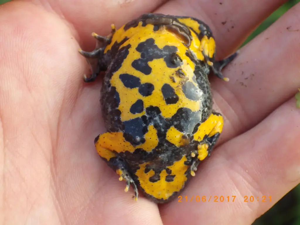 - Taille : Le Sonneur à ventre jaune est un anoure de petite taille entre 3,5 cm et 5,5 cm (4–5 cm en moyenne).