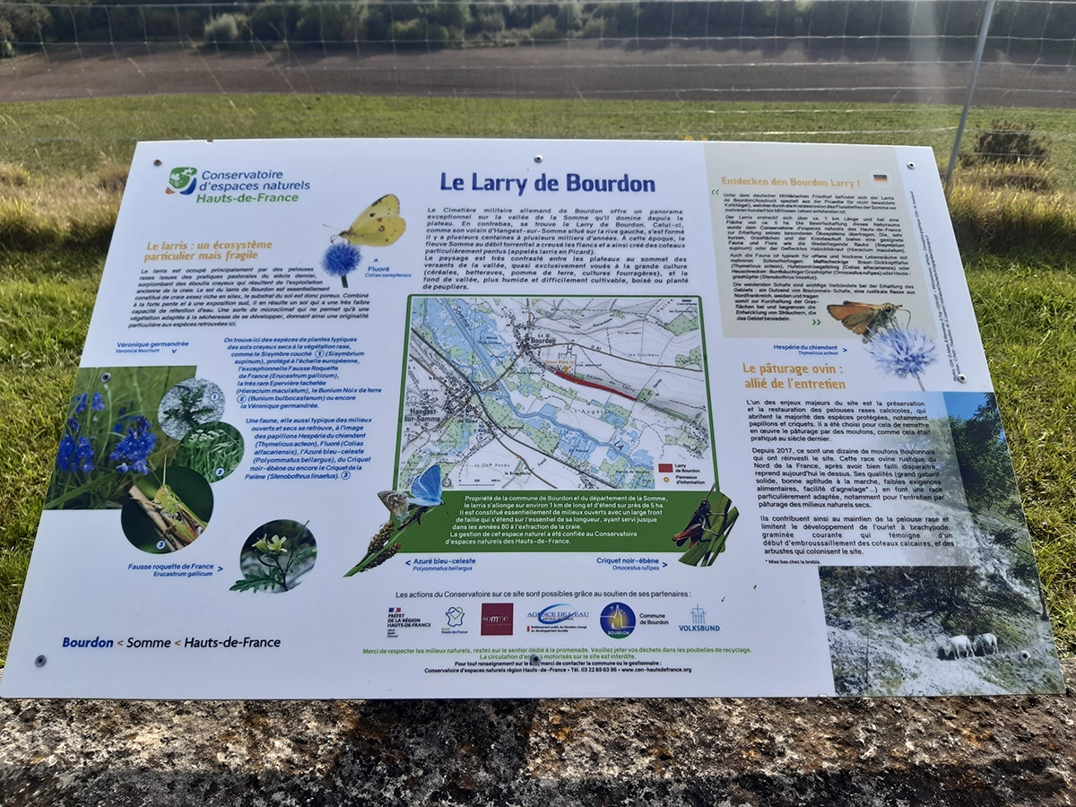 Localisé en rive droite de la Somme. Il est constitué de deux parcelles communales de 4,5 hectares et d’une parcelle du Conseil Départemental de la Somme. Sur plus de 5 hectares, le Larry de Bourdon présente une végetation typique des coteaux clacaires. Plusieurs plantes typiques de ces milieux sont présentes comme la Fausse roquette de France avec l’une des dernières stations présentes le Bunium noix de terre ou encore la Véronique germandrée. On retrouve sur le larry une faune typique des milieux secs et ouverts comme le papillon Héspérie du chiendent ou encore le Criquet noir-ébène. Le site riche de nombreuses espèces d’interet patrimonial est répertorié ZNIEFF et classé Natura 2000.