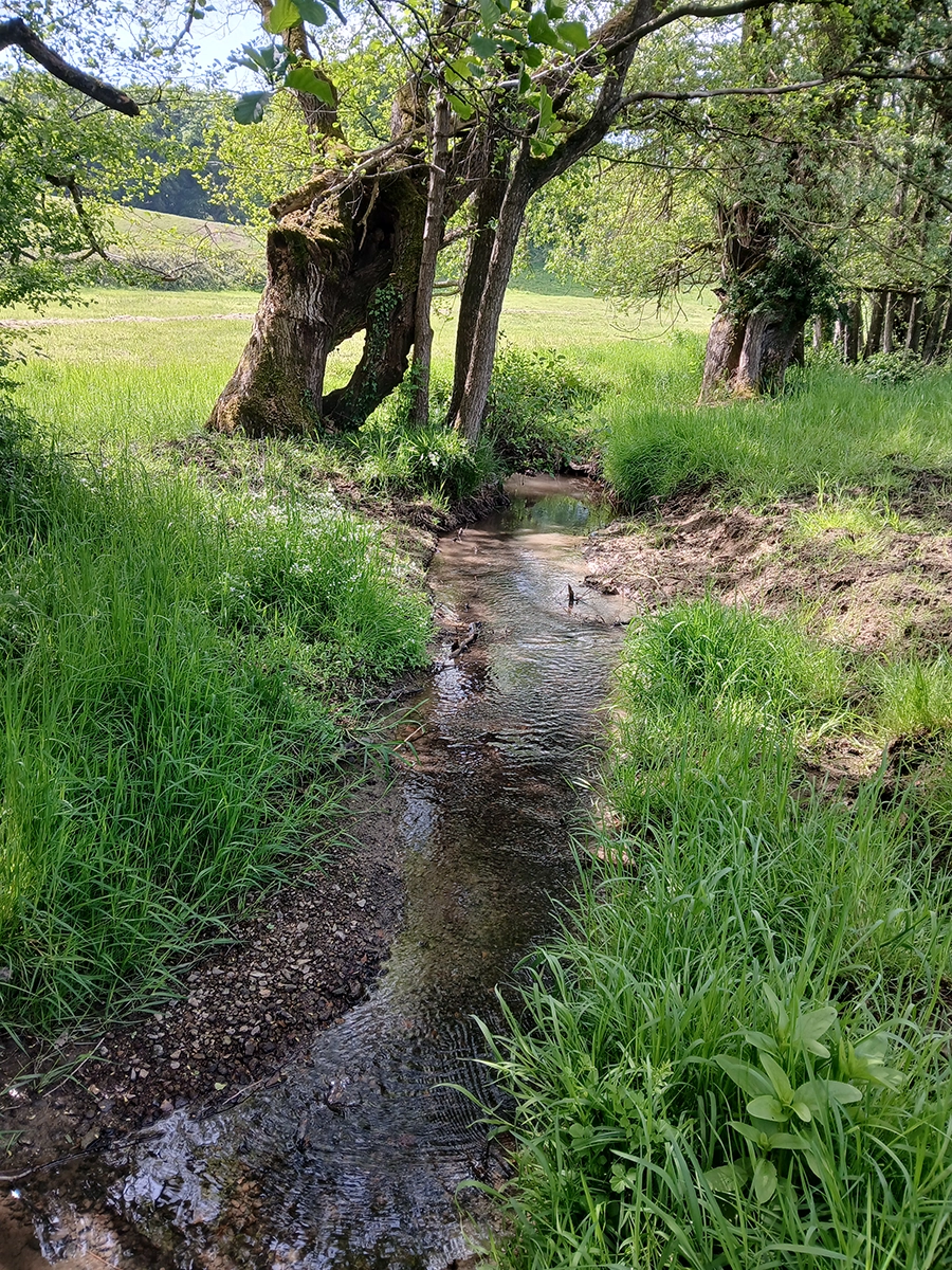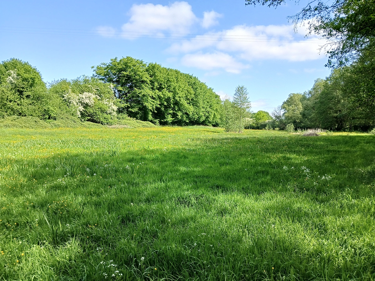 Prairies mésophile à hygrophile fauchées et pâturées, présentant de beaux alignements de charmes têtards, en berge du ruisseau Saint-Pierre, restaurées dans le cadre des mesures compensatoires à l’aménagement de la RN2.